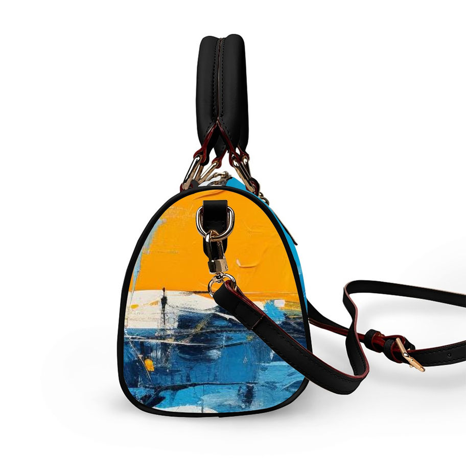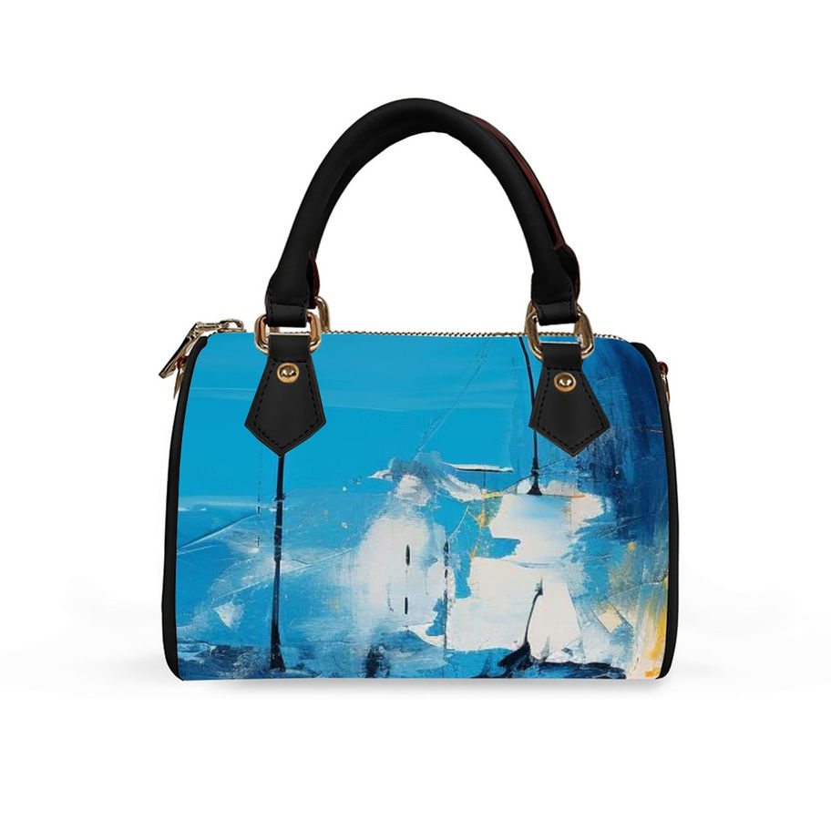 Measurement: 11"(L), 7"(H), 6"(W). Barrel-shaped design, adjustable shoulder strap, accented with metal hardware. Care Instruction: clean with a damp cloth; avoid direct sunlight and sharp objects.